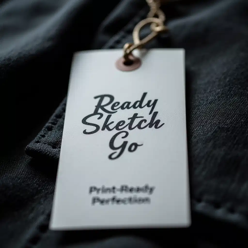 A close-up shot of a smooth, matte-finish apparel tag, freshly printed with the crisp 'Ready Sketch Go' logo, hanging off a high-quality garment. The focus is sharp on the tag, blurring the fabric slightly. Lighting: Soft directional light highlighting the matte texture. Typography: A concise subheadline 'Print-Ready Perfection' is subtly placed below the tag, confirming the service's promise for physical merchandise. Mood: Tactile, premium, quality-focused.