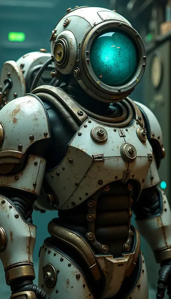 A heavy deep-sea exosuit with an industrial, rugged design. The suit is bulky and metallic, built from overlapping armored plates with a worn, weathered texture showing scratches and pressure marks. The chest area is reinforced with thick mechanical segments, circular valve-like modules, and exposed bolts. The shoulders are large and rounded, containing hydraulic joints and thick ridged padding. The arms and legs are layered with segmented armor, cables, and flexible tubing connecting joints, giving it a mechanical-powered look. The helmet is wide and circular, with a thick ring-shaped collar around the neck; the interior glows faintly blue-green from suit lights. Small utility lights are inset along the torso and shoulders, casting neon reflections. The color palette is a mix of metallic gray, steel, and greenish underwater lighting. The suit feels heavy, functional, and built to withstand extreme ocean pressure. Background elements can include dim metallic walls, control panels, and underwater-lab equipment, with strong green and blue illumination.