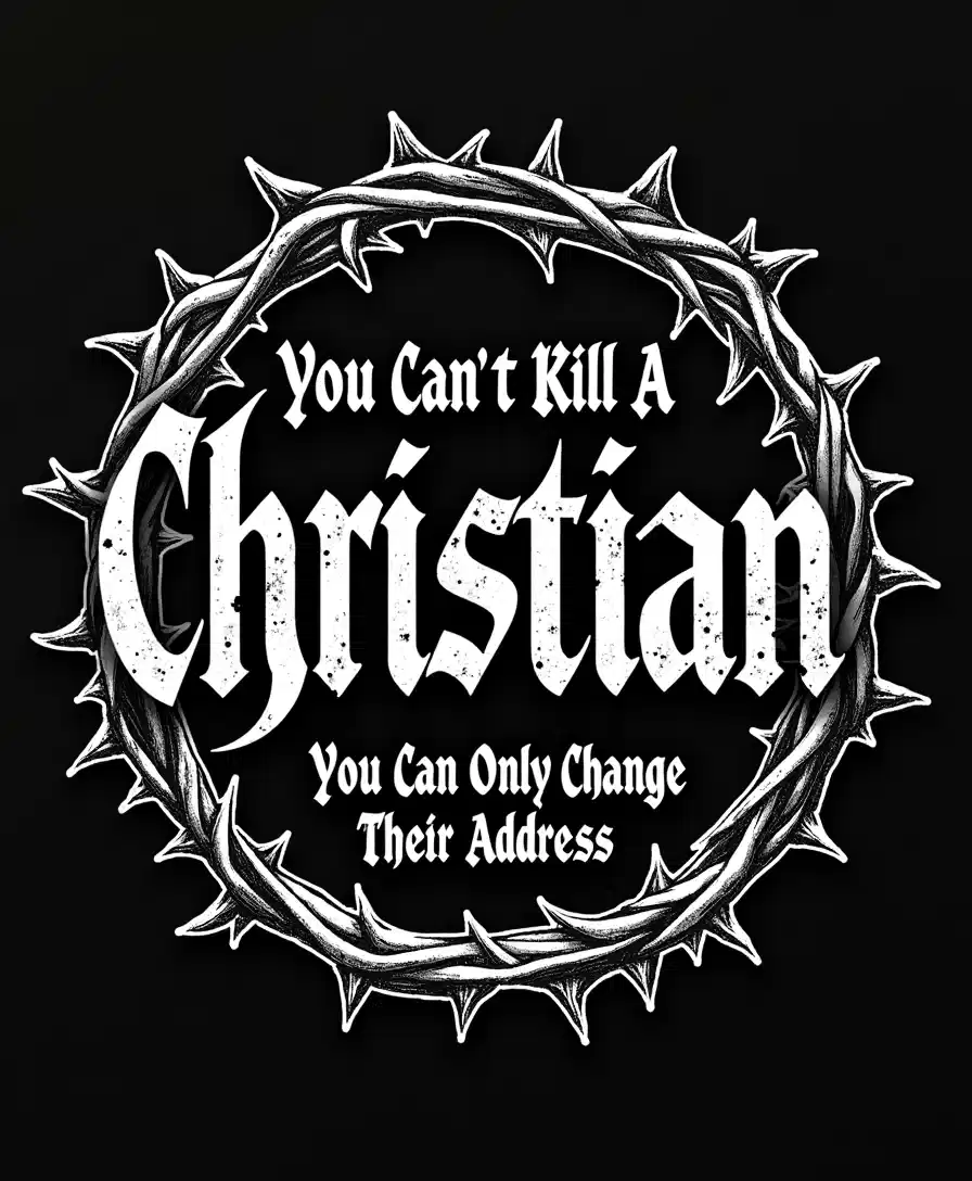 A distressed Christian T-shirt design that says “You can’t kill a Christian, you can only change their address.” Vintage western-style typography, cracked ink texture, cream text on faded black fabric, rustic and worn look, minimalist design.