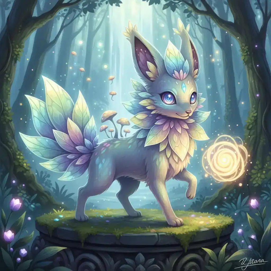 Create a brand-new, imaginary creature in the style of a Pokémon. It should be whimsical, appealing, and suited for a fantasy world, but not based on any existing Pokémon. The character should have a unique color scheme, playful or powerful pose, and signature features that make it stand out, but all design choices are up to you.