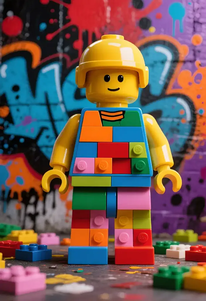 A Lego minifigure with a yellow head and arms, wearing a helmet, stands centered against a vibrant, abstract background. The minifigure's body is composed of multicolored Lego pieces in various shapes and sizes, featuring a mix of bright hues including orange, blue, green, red, and pink. The background is a dynamic, graffiti-style wall with splatters and splotches of paint in shades of black, blue, red, orange, and purple, creating a stark contrast with the minifigure. The floor around the minifigure is littered with scattered Lego pieces in different colors. The overall image is highly detailed, with a focus on the textured, layered appearance of both the minifigure and the background.