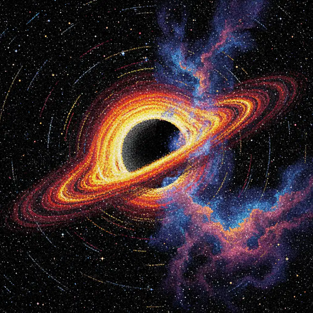 A cosmic scene with a dramatic black hole on the left and a vibrant nebula on the right, illustrated in pointillism style using thousands of tiny colored dots. The black hole features a dark center with a glowing accretion disk in bright yellows, oranges, and reds, while the right side shows swirling clouds of purple, blue, pink, and orange forming the nebula, with stars and cosmic dust scattered throughout a deep space background.