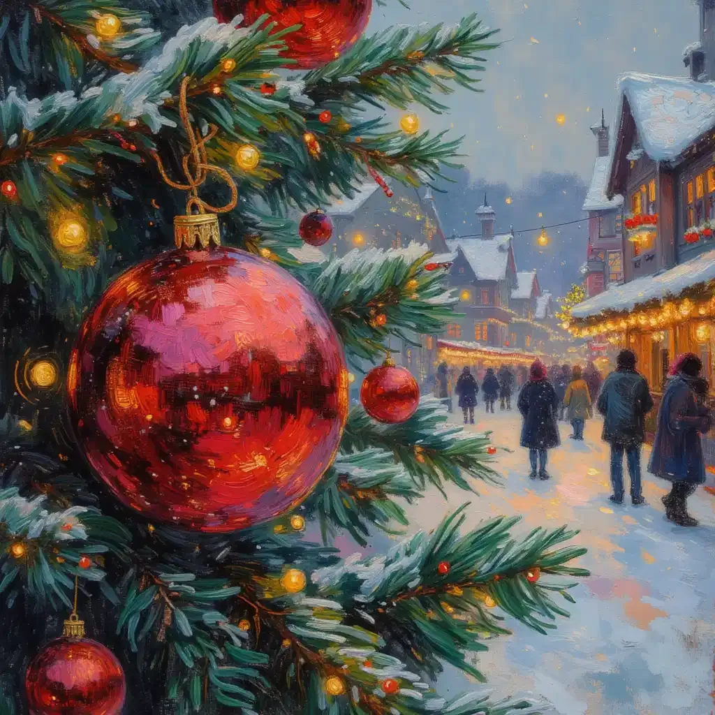 A vibrant close-up of a Christmas pine tree adorned with shimmering glass baubles in shades of emerald green, ruby red, sparkling gold, and icy silver. The ornaments are round and glossy, catching reflections of a cozy winter town where people are enjoying festive activities. Soft, fresh pine needles frame the scene, with a vivid red bauble as the focal point and other ornaments partially surrounding it. The overall feeling is cheerful and warm, capturing the joyful spirit of the holidays.