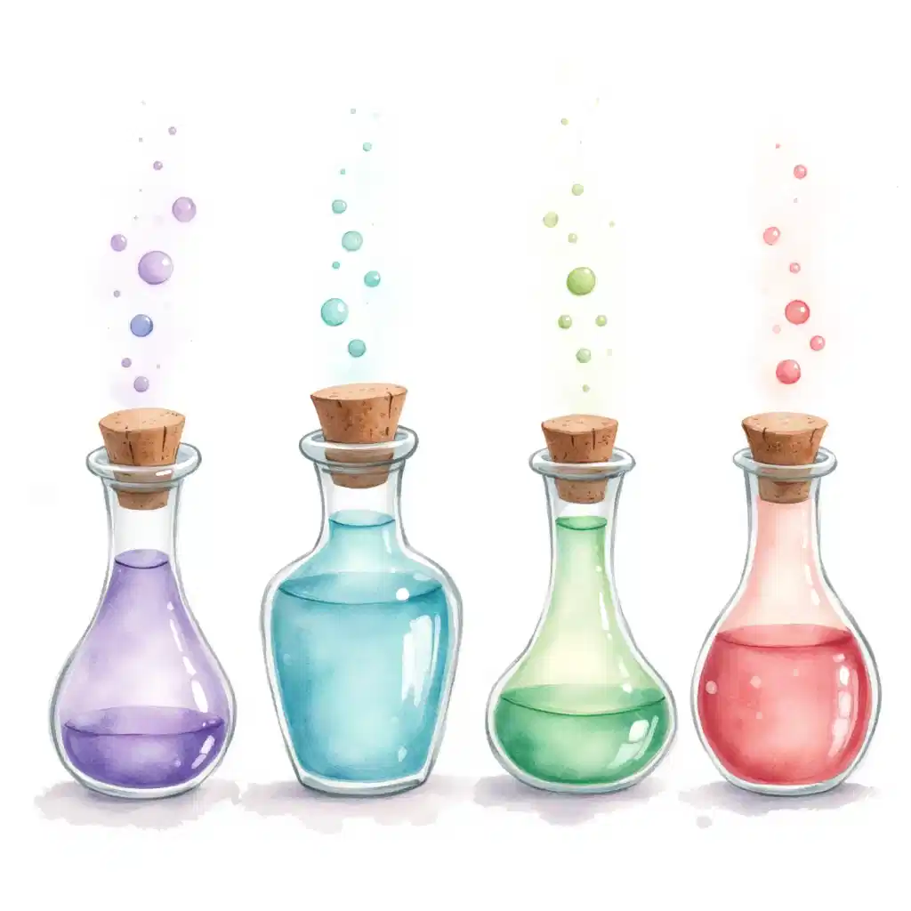 A set of four cute potion bottles, each uniquely shaped and filled with shimmering liquid. One bottle glows with pastel lavender, another with mint green, a third with baby blue, and the last with rose pink. Each bottle has a rustic cork stopper and delicate paper label featuring whimsical, hand-drawn designs. The scene is painted in soft watercolor style with clean, gentle outlines. The pastel shades blend softly, creating a magical effect, and tiny bubbles appear to rise inside each potion. The overall illustration has a clean, vector-like appearance with subtle shading to add depth.